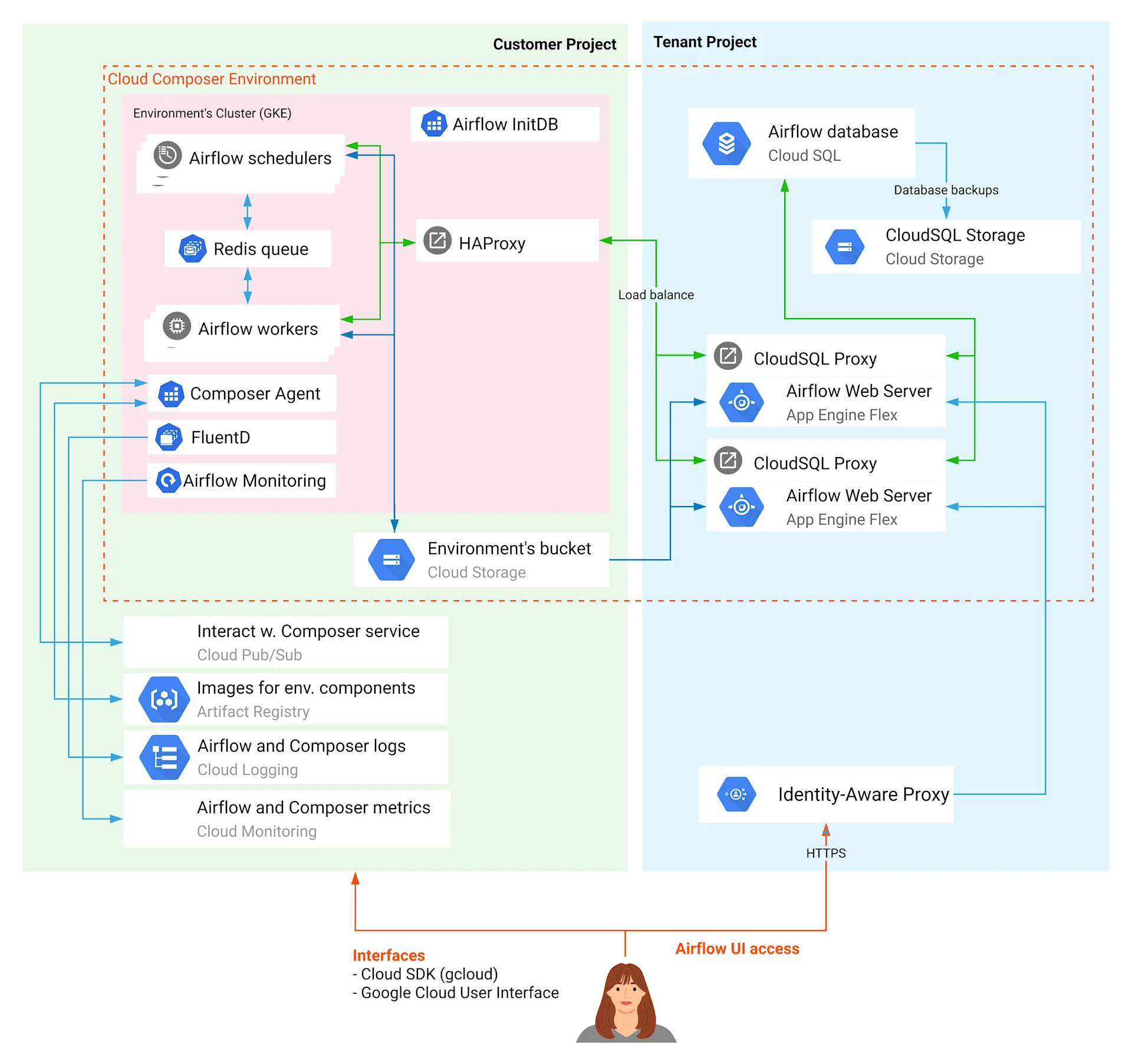 - Servidor web: La interfaz web de Apache Airflow se ejecuta en el servidor web, protegido por Identity-Aware Proxy. Consulte la Interfaz web de Airflow para más información.