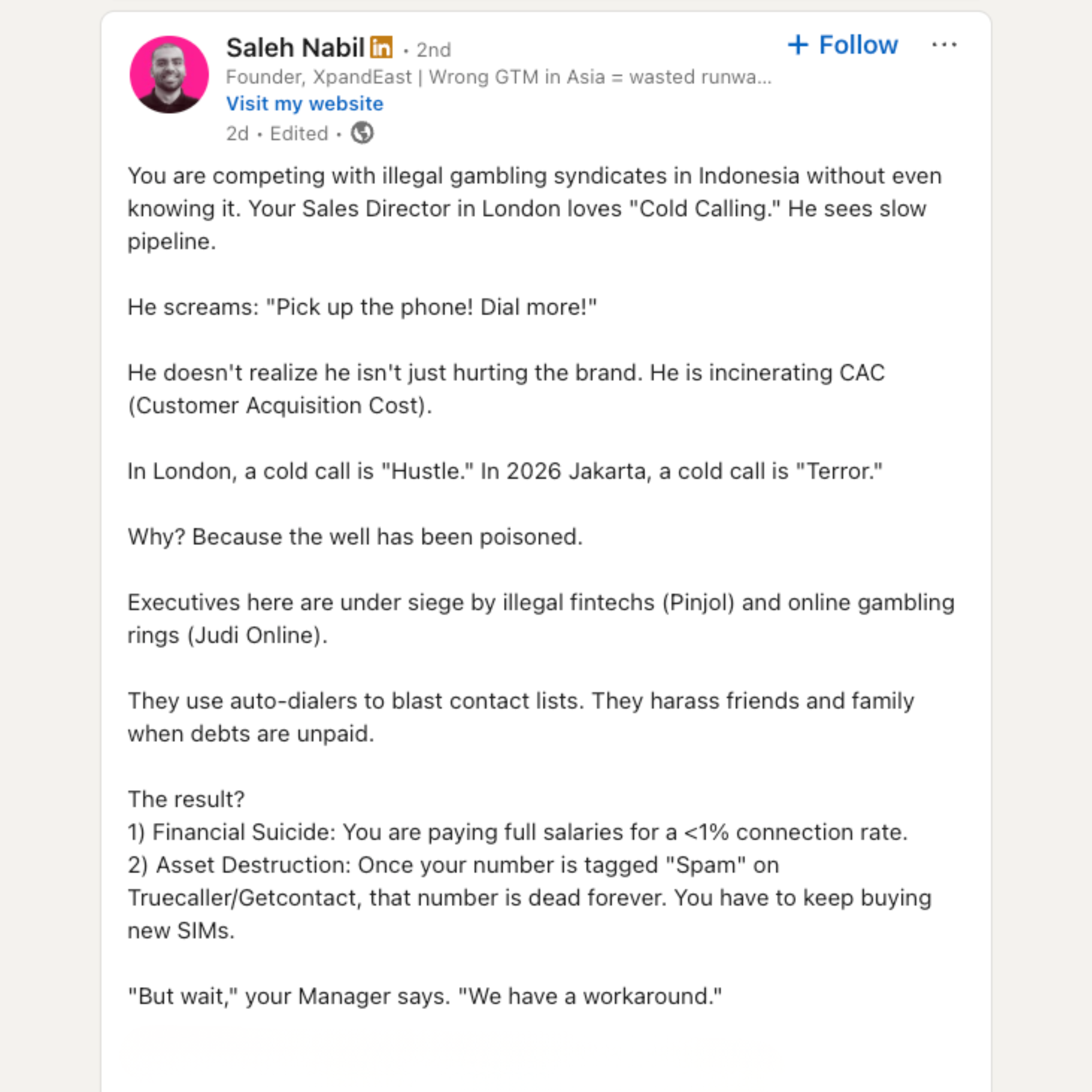 Not only does WhatsApp affect customer satisfaction and loyalty, but in this particular LinkedIn post by Saleh Nabil, he wrote, “In London, a cold call is 'Hustle’. In 2026 Jakarta, a cold call is ‘Terror’." Is it really?