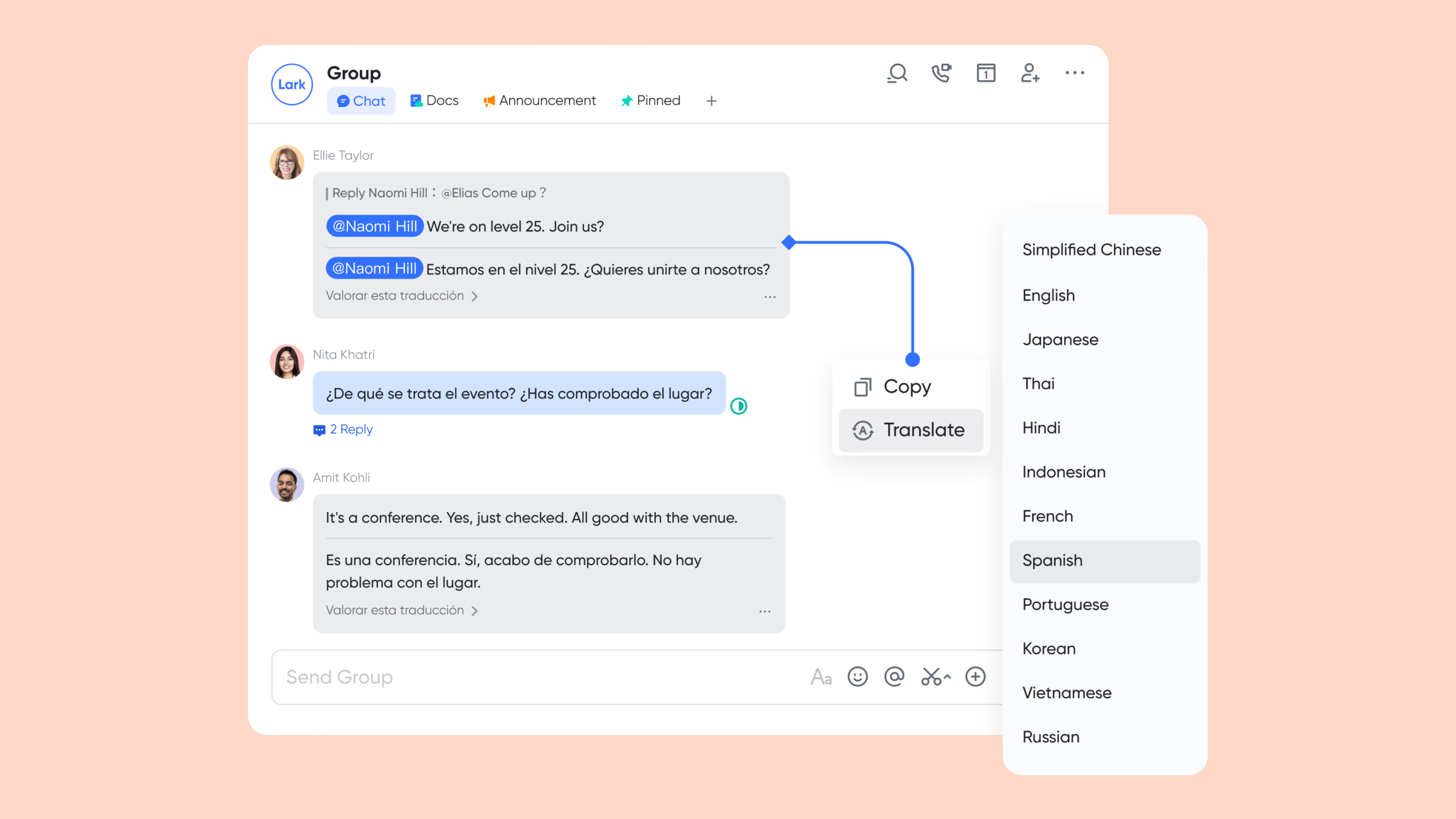 Language gaps between local teams and regional stakeholders can lead to misunderstandings. Lark features instant, AI-powered translation for chats, docs, and even video subtitles. This ensures your local talent and international partners are always on the same page, fostering true collaboration without the friction of a language barrier.