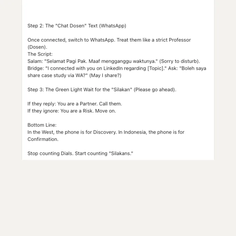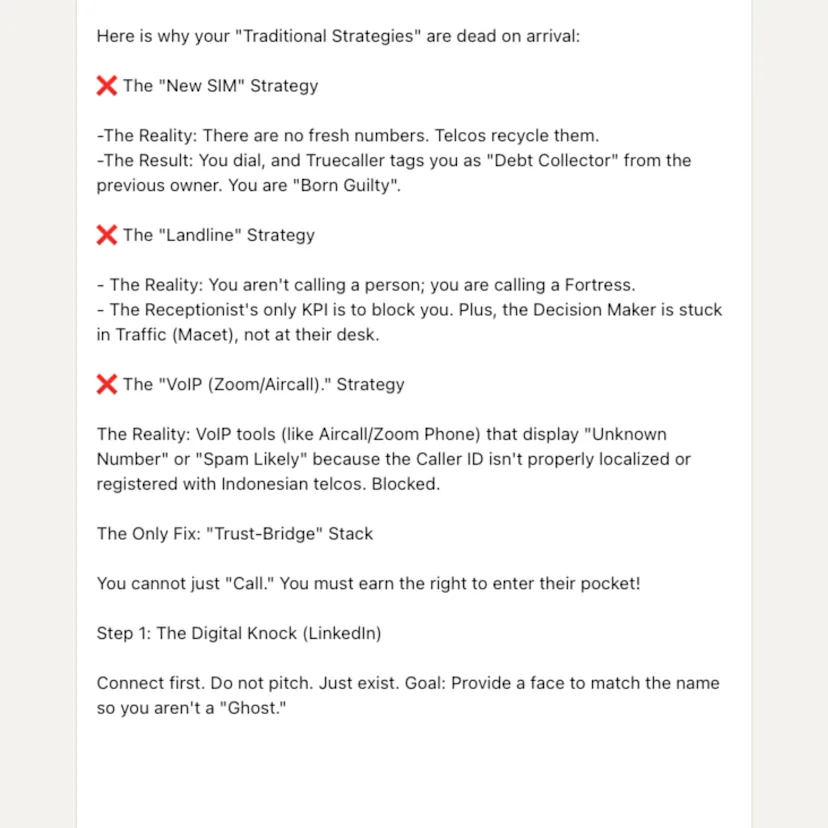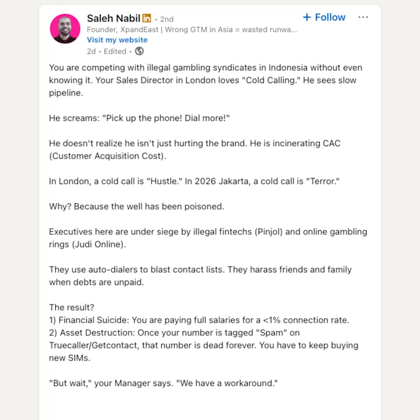 In Indonesia, for example, not only does WhatsApp affect customer satisfaction and loyalty, but in this particular LinkedIn post by Saleh Nabil, he wrote, “In London, a cold call is 'Hustle’. In 2026 Jakarta, a cold call is ‘Terror’." Is it really?