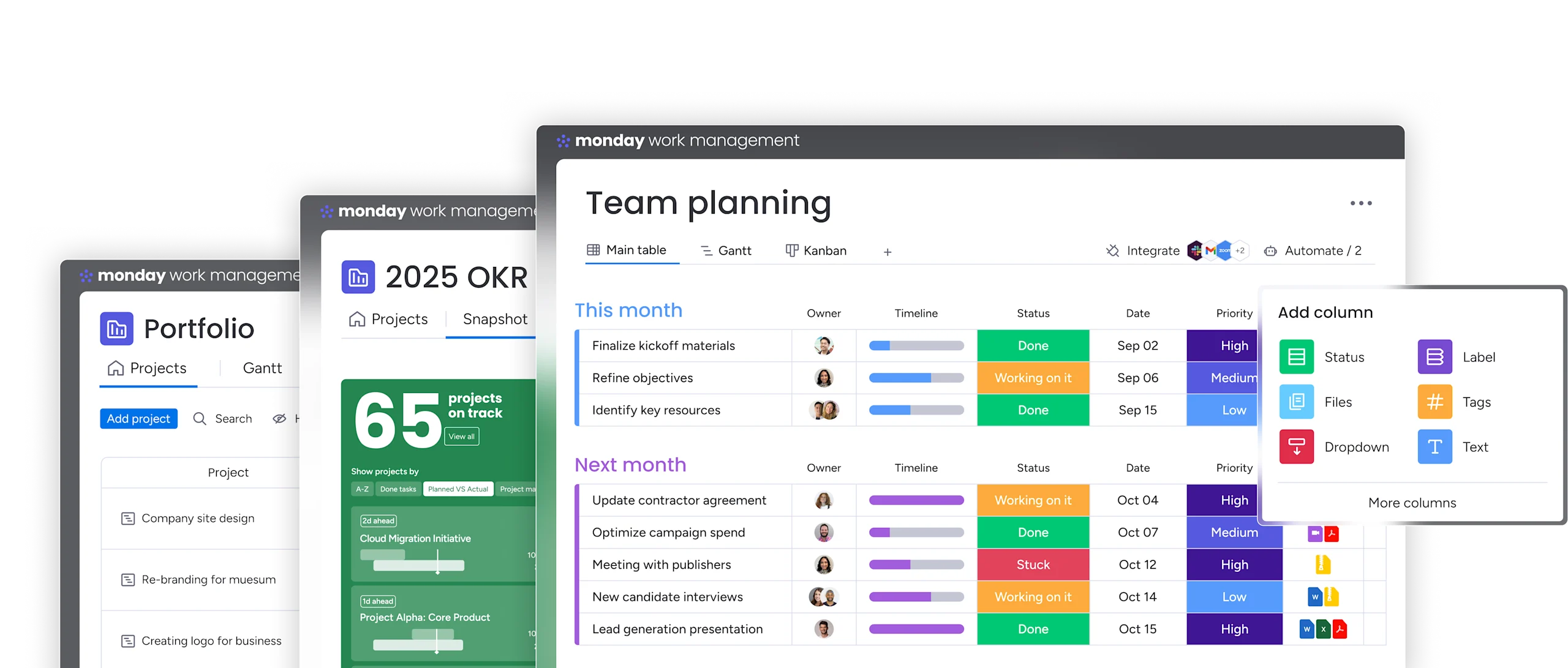 Manage projects, tasks, and resources with multiple views, like Kanban, Gantt, Timeline, Workload, and more, inside monday Work Management