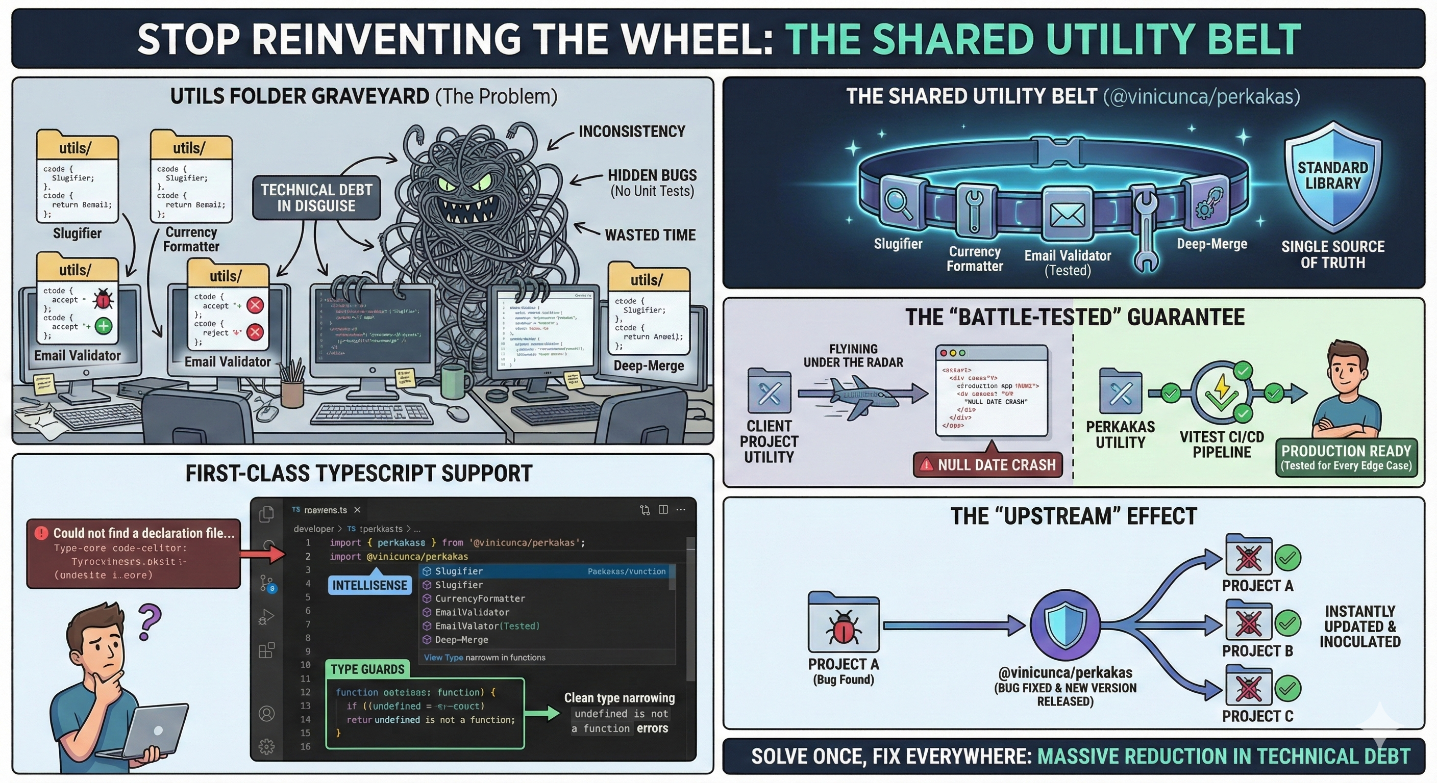 Sistem kami, secara fundamental, mengubah proses yang kacau ini. Ketika kami menemukan bug di dalam utility function yang sedang digunakan, misalnya, di dalam Proyek A, kami sengaja tidak memperbaikinya hanya di dalam codebase proyek spesifik tersebut. Sebaliknya, kami melacak sumber masalah tersebut kembali ke satu-satunya sumber yang berwenang: utility library bersama core kami, @vinicunca/perkakas.
