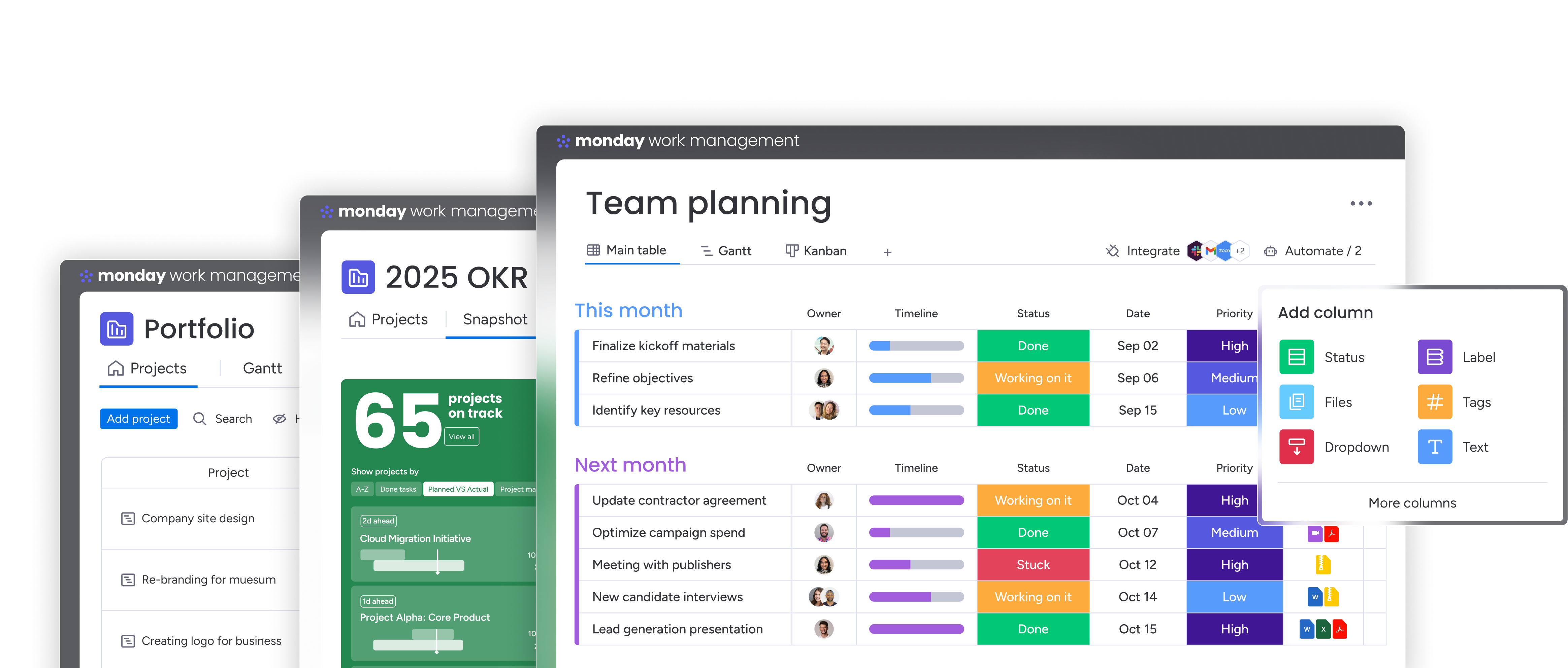 Kelola proyek, tugas, dan sumber daya lewat beragam tampilan, seperti Kanban, Gantt, Timeline, Workload, dan masih banyak lagi, semuanya di dalam monday Work Management.